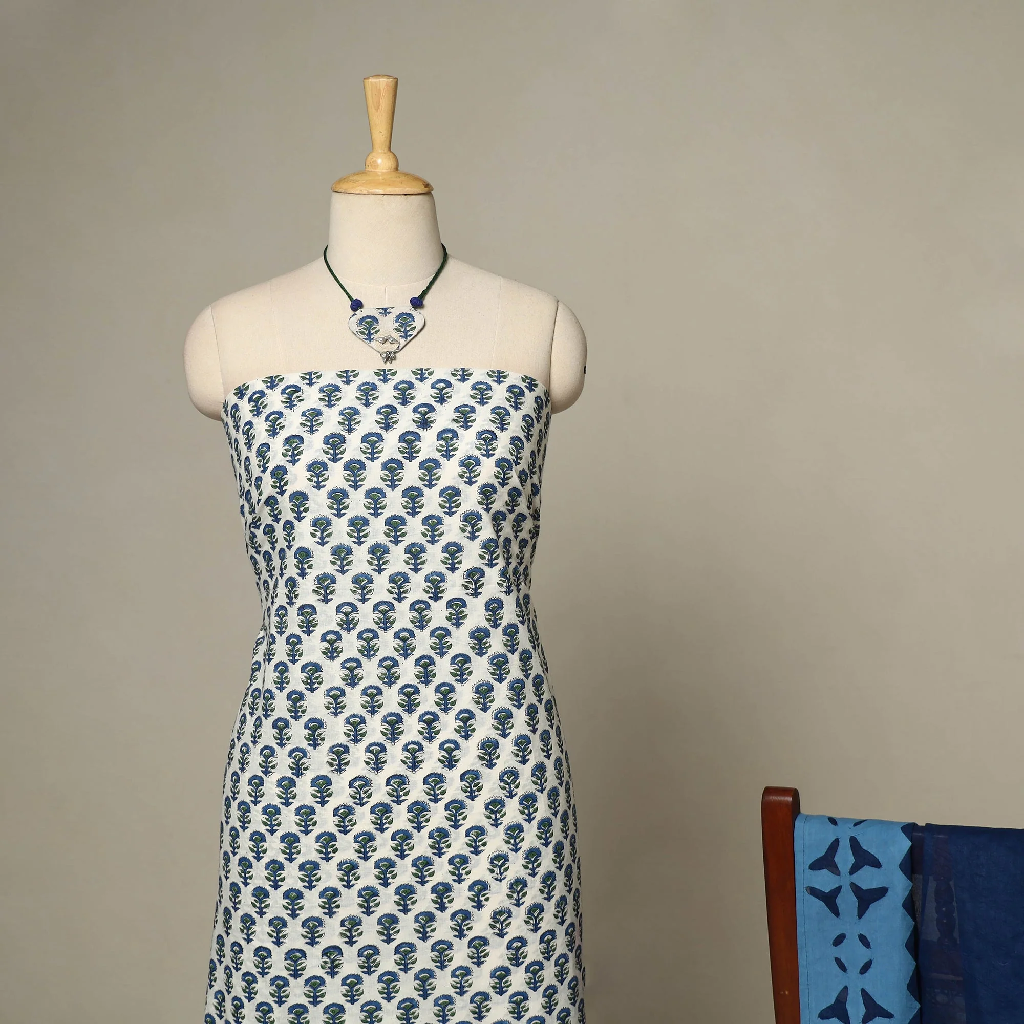 White - 2pc Cotton Unstitched Sanganeri Dress Material with Jewellery Set 01