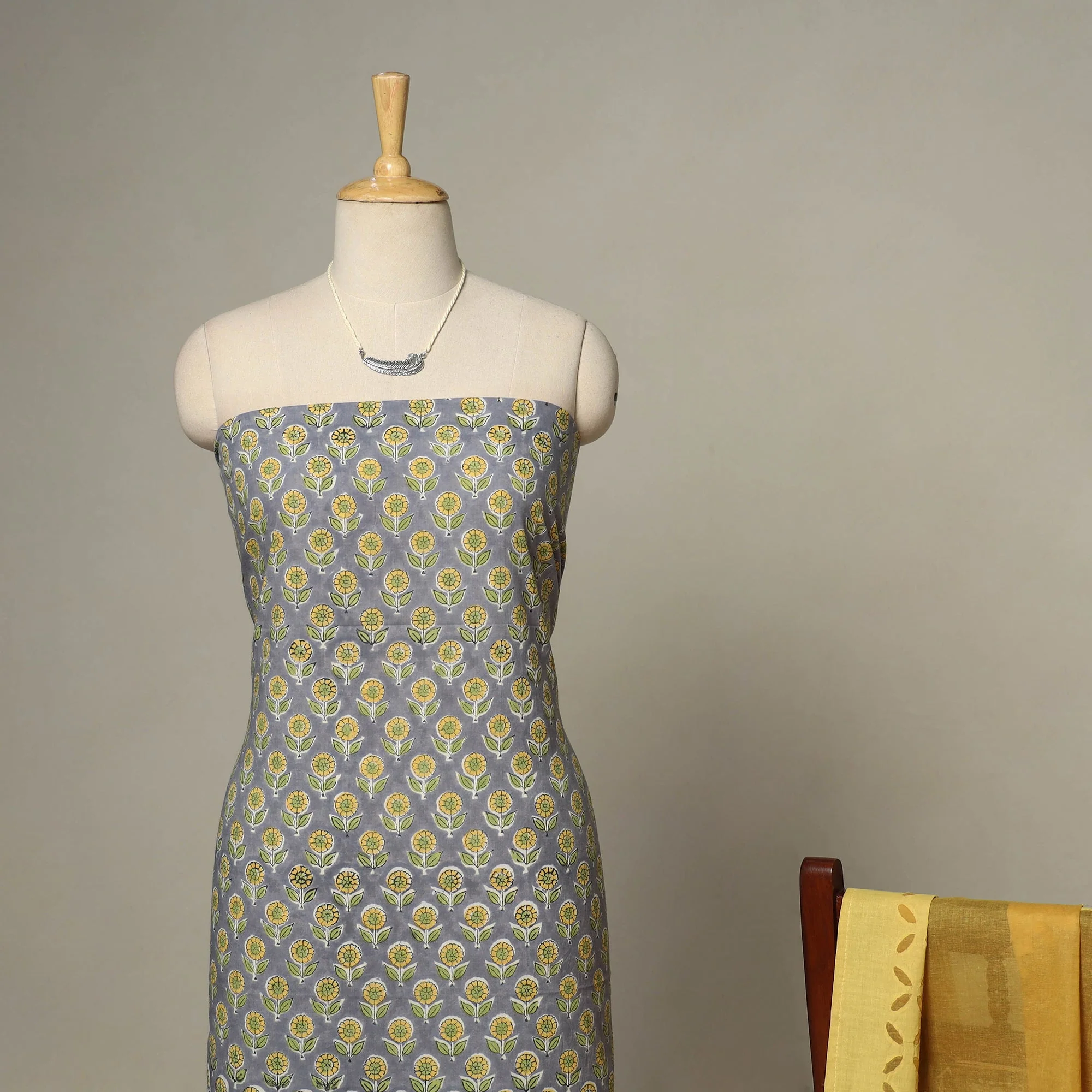 Grey - 2pc Cotton Unstitched Sanganeri Dress Material with Jewellery Set 08