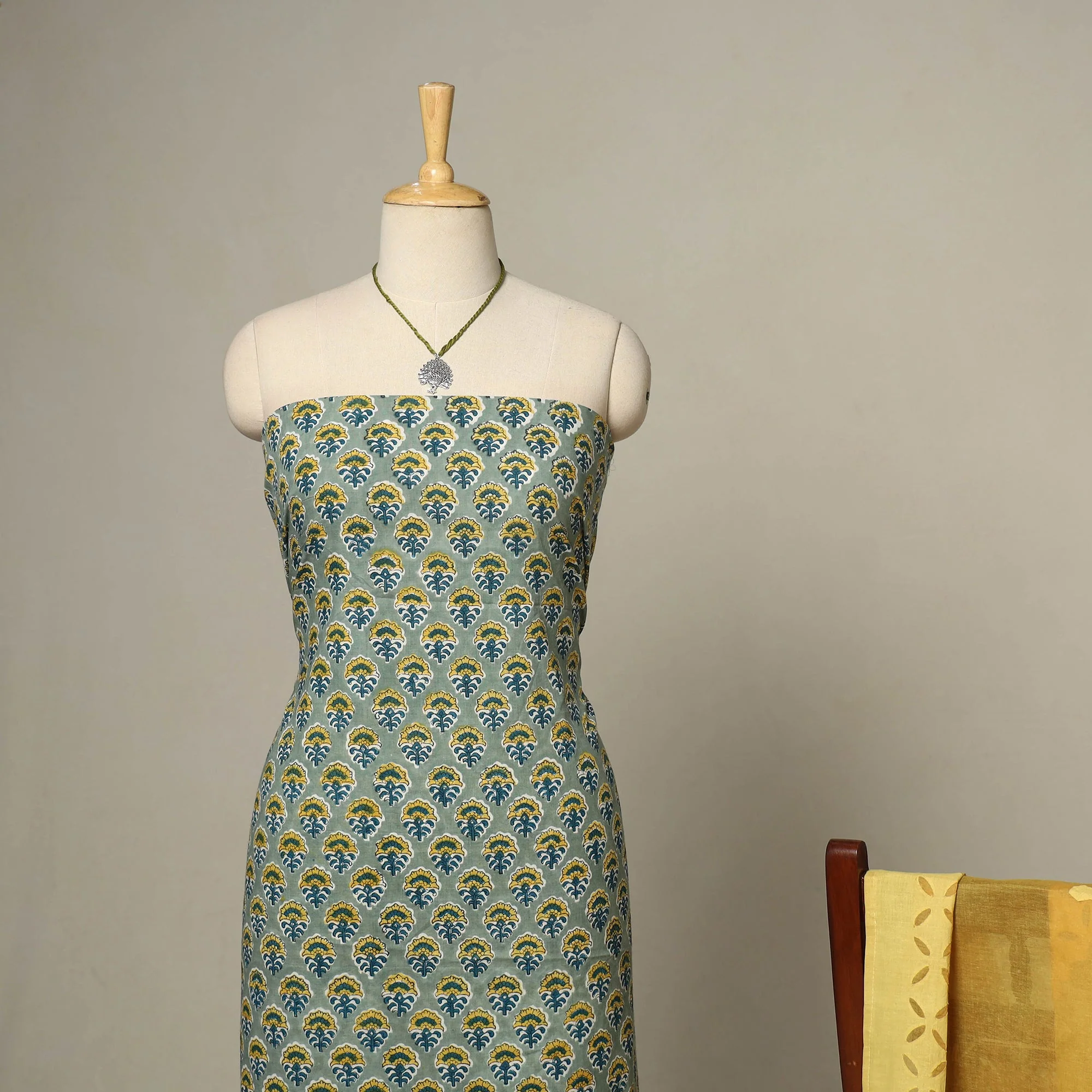 Green - 2pc Cotton Unstitched Sanganeri Dress Material with Jewellery Set 10