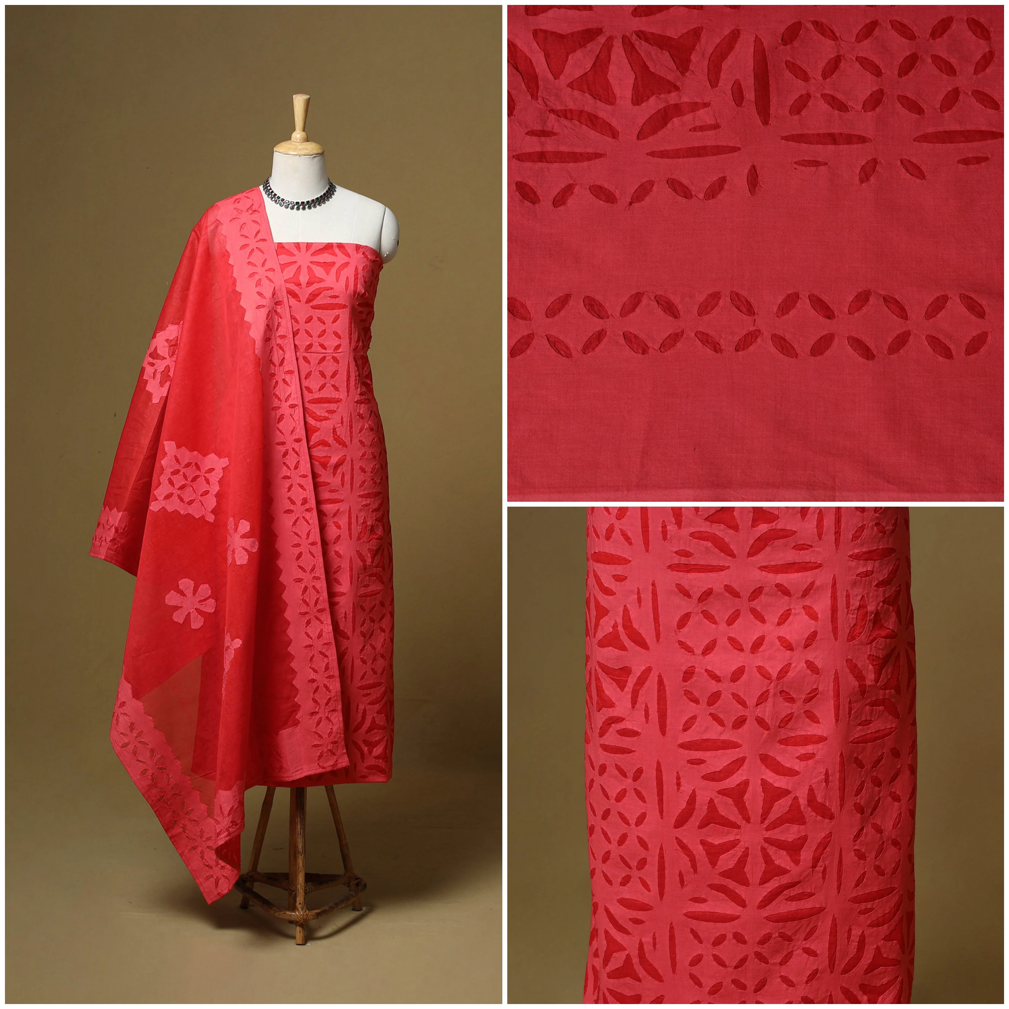 Red - Barmer Cut Work Cotton Applique 3pc Unstitched Dress Material 08